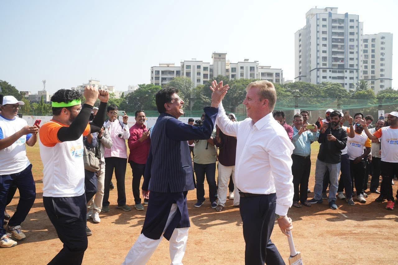 Then came the neighbourhood cricket match at Goyal’s parliamentary constituency in Mumbai. Nearly 30,000 people in the stands, cultural performances and cameras everywhere. McClay picked up a bat. Someone handed Goyal a ball.